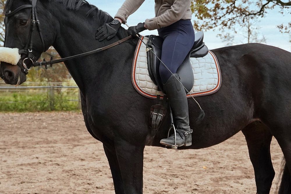 Entraînement avec le cheval noir de Bayer Baveria sur un manège en automne