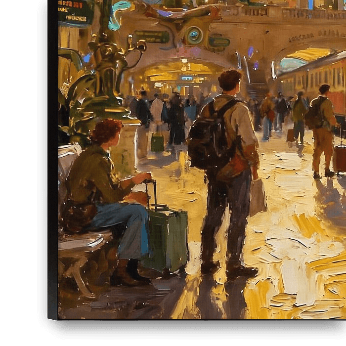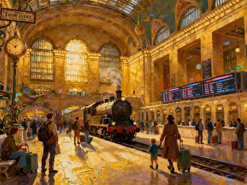 La scène montre le moment précis entre l'immobilité et le mouvement. Sous les hautes fenêtres et les plafonds voûtés, la vie s'agite tandis qu'un train historique s'apprête à partir. La lumière dorée confère au lieu un caractère presque sacré et souligne le dynamisme du voyage. L'image condense des thèmes tels que la transition,…