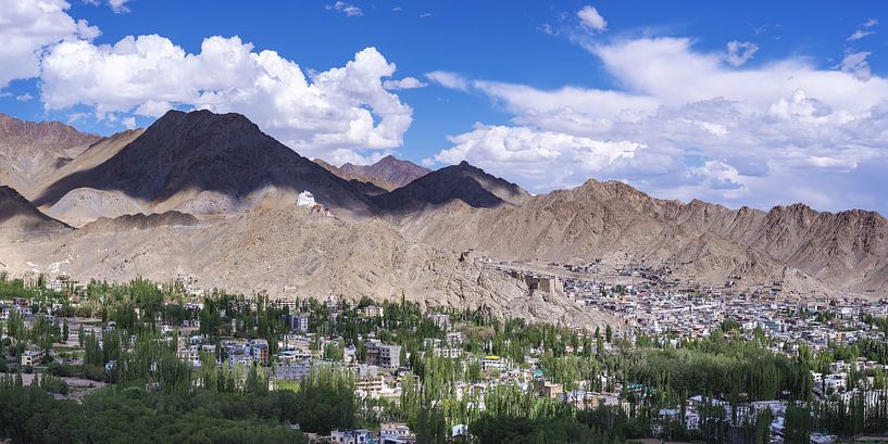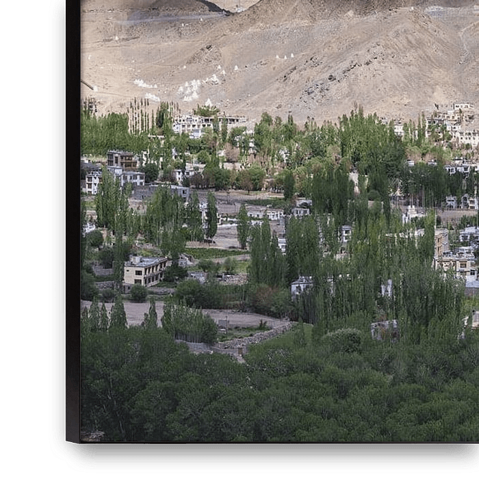Leh repose là, telle une pensée silencieuse entre ciel et terre. La ville s'étend dans la vallée, mosaïque de maisons, de chemins et de vie, encadrée par des rangées de peupliers élancés qui ponctuent le paysage comme des points d'exclamation verts. Leur bruissement est doux, presque solennel, comme s'ils avaient conscience de la grandeur de l'espace qu'ils accompagnent. Au-dessus de tout cela trône Namgyal Tsemo Gompa sur la colline de Tsenmo. Le monastère ne semble pas monumental, mais vigilant. Il surplombe la ville, la vallée de l'Indus, et plus loin encore, là où les chemins disparaissent et les pensées s'en vont. Les montagnes environnantes sont arides et vastes, leurs couleurs sobres, presque ascétiques. Elles évoquent la patience, des périodes qui échappent à l'échelle humaine. La lumière est claire ici, incorruptible. Elle ne brouille rien, révèle chaque contour et laisse pourtant place au silence. Entre les murs de la ville et les pentes des montagnes, un équilibre fragile et fort à la fois s'installe. Le quotidien et la spiritualité coexistent sans se bousculer. Ce panorama dégage une tranquillité particulière. Ce n'est pas une absence de vie, mais son ordre conscient. Leh n'est pas un lieu qui s'explique. Il invite à regarder, à s'attarder et à adapter son rythme à celui du paysage.