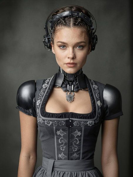 Ce portrait montre un personnage délibérément positionné à l'intersection de la grâce humaine et de la précision technique. Le regard est ouvert, calme et directement dirigé vers le spectateur. Il ne semble ni exigeant ni soumis, mais attentif, presque curieux. Il y a une irritation subtile dans cette ouverture : l'expression est familière, mais elle reste contrôlée et exempte d'émotion spontanée.