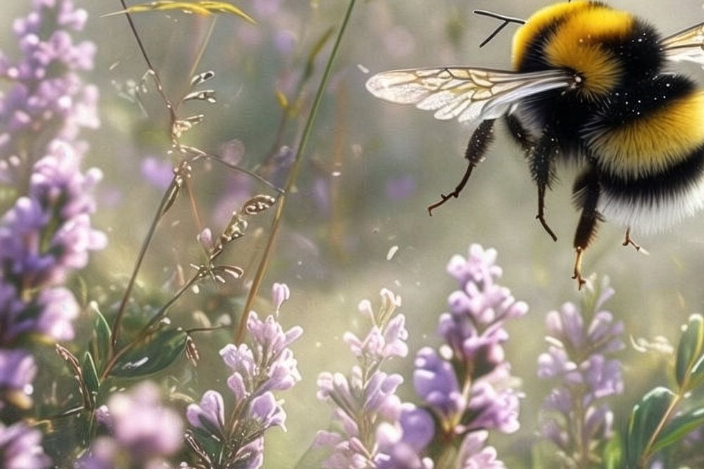 Un bourdon vole parmi de délicates petites fleurs violettes, entouré d’une lumière qui semble s’attarder dans l’air. Tout semble léger et paisible, comme si le temps s’écoulait ici un peu plus lentement.