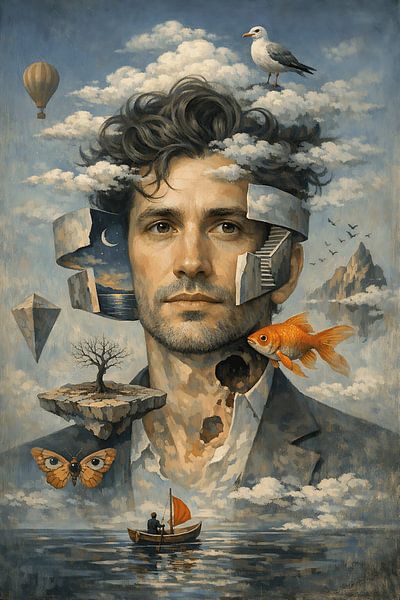 Un homme surréaliste dont l'espace intérieur s'ouvre : des cheveux en forme de nuages, un escalier plongeant dans le bleu nuit, des îles flottantes, un poisson doré et un petit bateau qui glisse à travers un paysage onirique et silencieux.