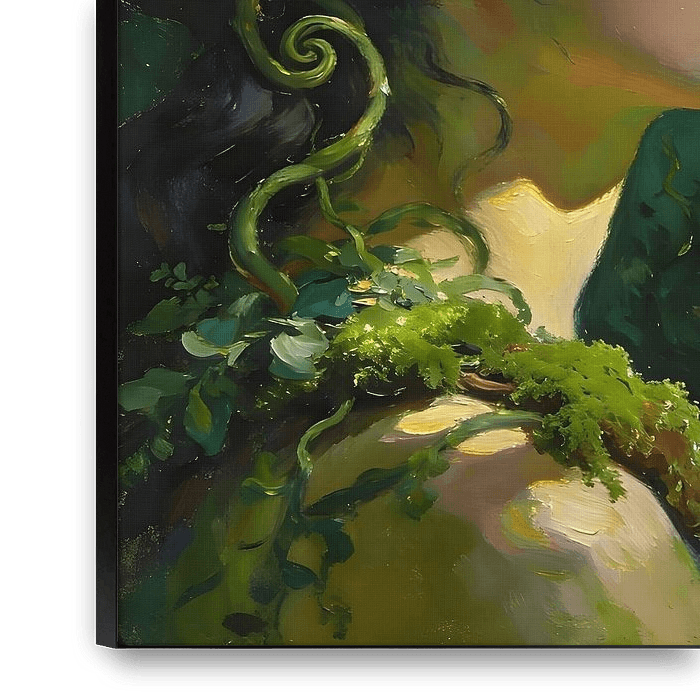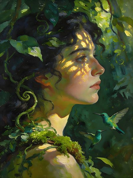 Dans cette œuvre, une jeune femme est représentée de profil, entourée d'un feuillage luxuriant. La lumière chaude du soleil dessine des motifs sur son visage et son cou. Un colibri vole près d'elle, entouré de plantes grimpantes et de mousse.