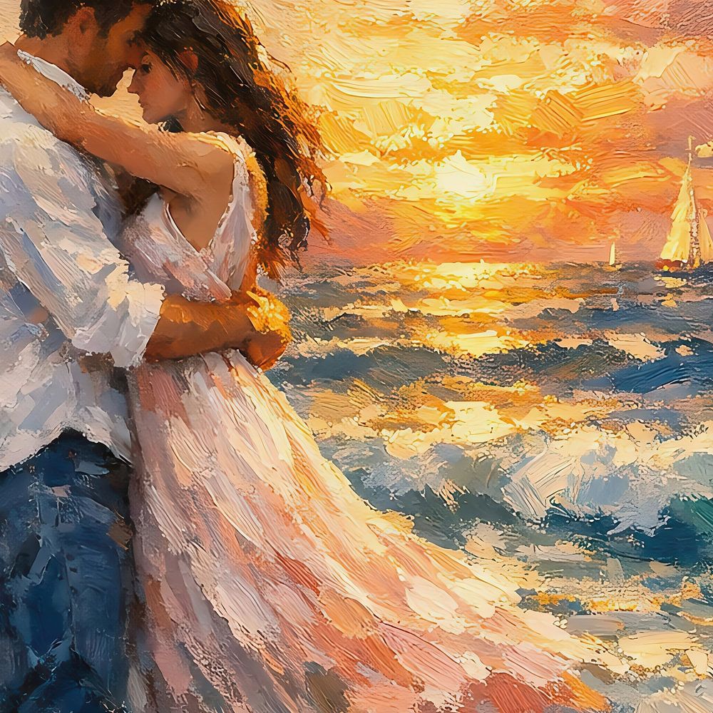 Peinture impressionniste représentant un couple enlacé dans les eaux peu profondes de l'océan au coucher du soleil.