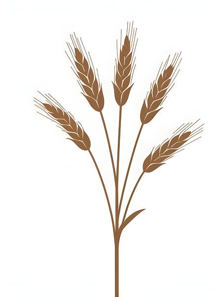 Illustration simple et élégante de tiges de blé regroupées dans des teintes classiques de brun doré. Le dessin épuré montre de multiples têtes de grains avec des soies caractéristiques (awns) et des grains qui se chevauchent, sur un fond neutre. Idéal pour les logos de boulangerie, les emballages de farine, les documents de l'industrie…