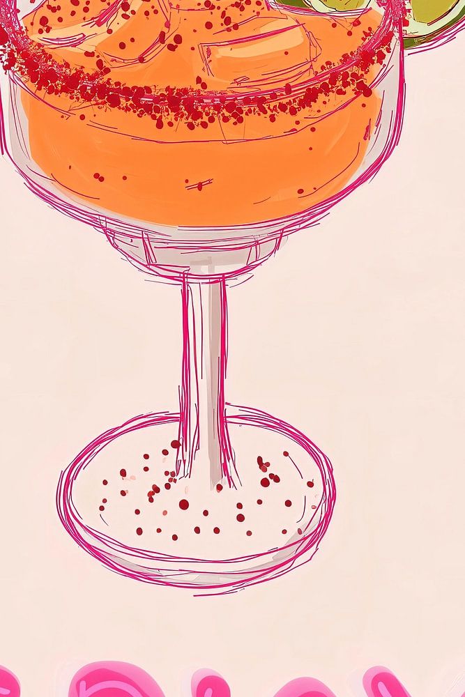 Une illustration numérique ludique d'un verre à cocktail rempli de ce qui semble être une margarita épicée, ornée d'une garniture de citron vert et d'un bord épicé. L'image arbore un style minimaliste, des tons chauds et terreux, rehaussés de touches de rose éclatantes. Sous le verre, le mot « SPICY » est inscrit en lettres rose fluo éclatantes, capturant parfaitement l'essence de cette boisson à la fois rafraîchissante et piquante.