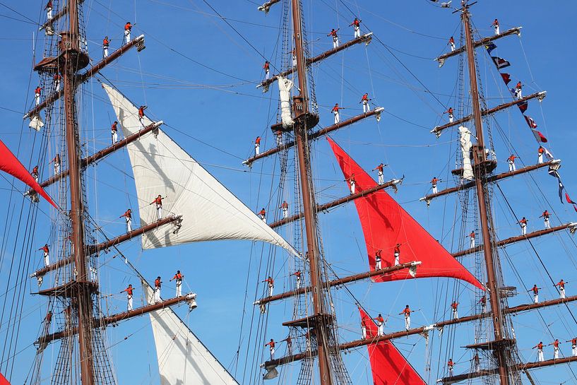 Dans les mâts, des dizaines de marins sont suspendus très haut au-dessus de l'eau. L'équipage se tient dans le gréement du mât du navire, à côté, en dessous et au-dessus des immenses voiles qui flottent au vent. Un imposant jeu de lignes.