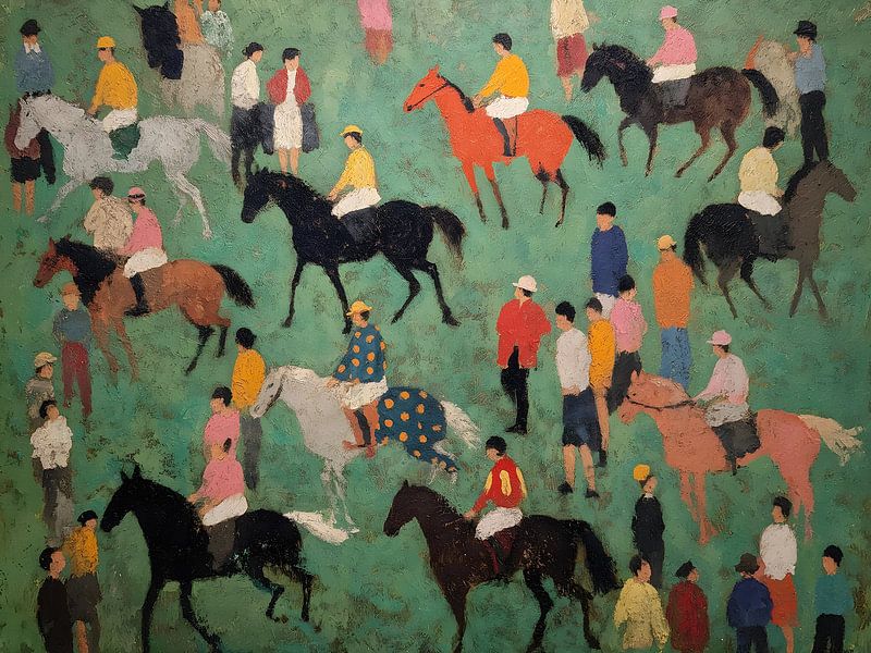 Une composition vivante, peuplée de cavaliers et de personnages pleins de vie, qui rend toute l'énergie d'une journée de courses animée. Cette œuvre expressive apporte mouvement, charme et une touche de fantaisie à n'importe quel espace.