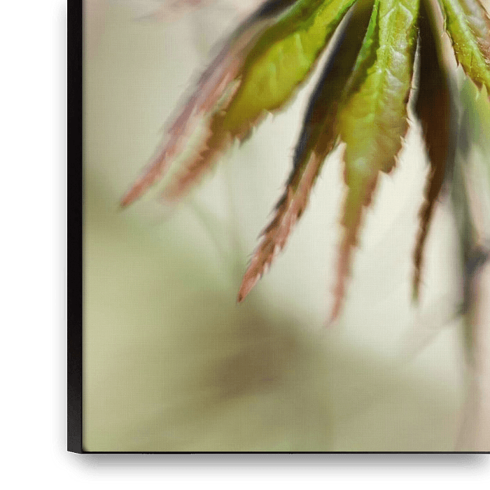 Feuilles d'érable en bourgeons au printemps. Une image verticale avec beaucoup de flou pour donner à l'ensemble un aspect pittoresque. Elle confère à votre espace une atmosphère naturelle dans des tons chauds.