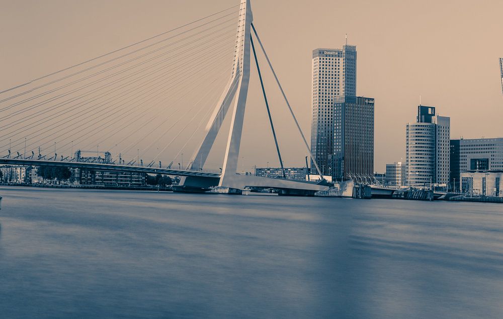 vanaf de Maasoever heb je een schitterend uitzicht op de skyline van Rotterdam. De Erasmusbrug, De Rotterdam van Koolhaas, bepalen het beeld van dit stukje Rotterdam. De foto is in de avond gemaakt met de ondergaande zon op de brug en de gebouwen. De afwerking in duotone geel en blauw geeft een speciale sfeer.