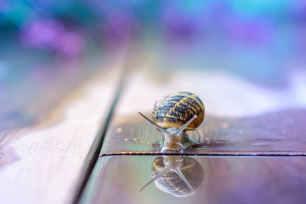 Après la pluie, les escargots sortent ... cela donne souvent une très jolie image, une image miroir dans une flaque réglementaire ... et avec la lavande en fleur en arrière-plan, on obtient les plus belles couleurs ...