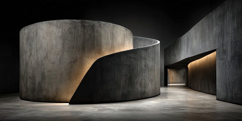 Cette image montre un espace architectural réduit en béton massif, caractérisé par une grande structure murale incurvée. La forme dominante s'étend en demi-cercle à travers l'espace et crée une séparation claire entre le premier plan et l'arrière-plan, sans pour autant fermer complètement l'espace. L'architecture n'apparaît pas ici…