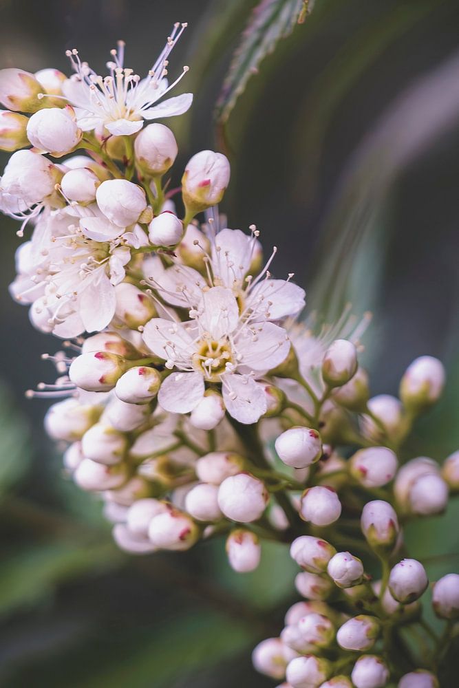 De délicates fleurs blanches brillent sous une voûte de feuilles sombres. Photographie de la nature dans le style Moody.