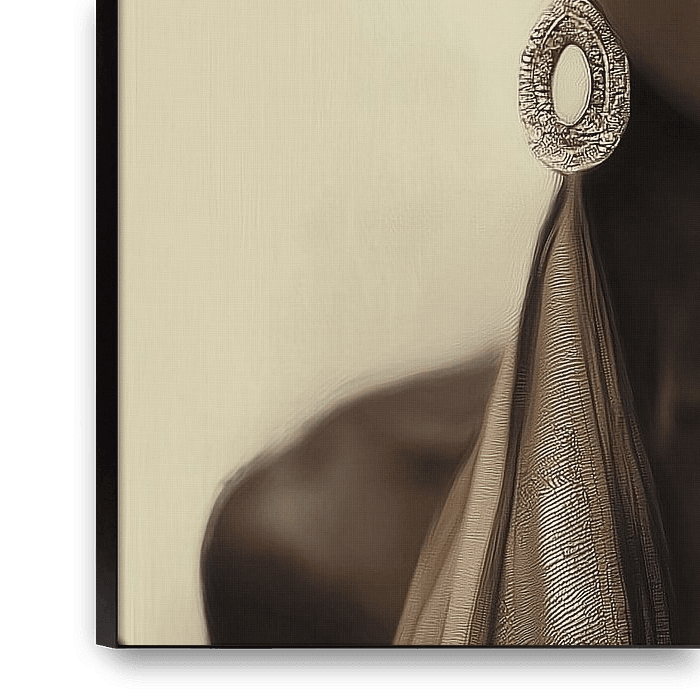Le foulard élégamment enroulé constitue un élément visuel important. Le tissu est composé de tons terreux harmonieux avec un léger éclat, ce qui dégage une impression de luxe, d'élégance et de richesse culturelle. Les plis soigneusement représentés confèrent au tissu un mouvement dynamique et fluide. Les grandes boucles d'oreilles détaillées renforcent l'aspect élégant et royal du portrait et ajoutent une touche décorative subtile.