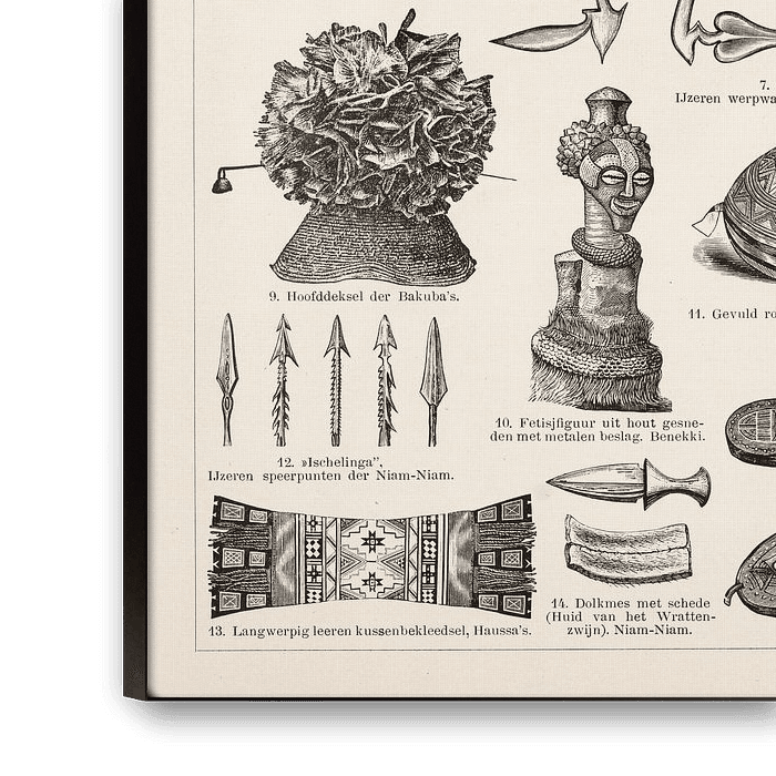 Image ancienne datant d'environ 1905 et représentant des objets ethnographiques et ethniques d'Afrique. On y voit des figurines, des masques, des armes et des ustensiles des Baluba, des Bakuba et des Niam Niam, entre autres.