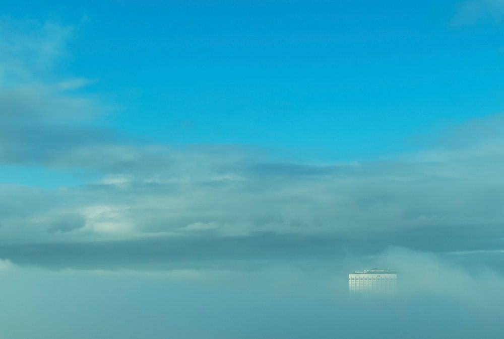 Le sommet de l'Euromast et l'Erasmus MC s'élèvent encore à peine au-dessus des taches de brouillard.