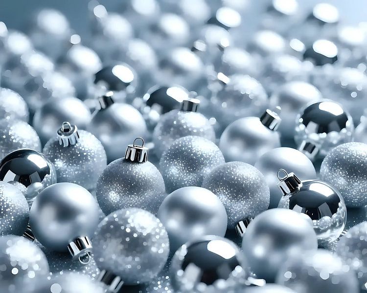 L'image déploie une festivité opulente, presque écrasante : chaque centimètre de la scène est recouvert de boules de Noël chatoyantes et d'étoiles scintillantes, si bien que le regard plonge comme dans une mer de décorations. Des boules de toutes les couleurs imaginables - rouge rubis profond, vert sapin saturé, or chaud, argent froid et bleu éclatant - sont posées en rangs serrés ou suspendues à des fils très fins et reflètent la lumière en de multiples points de brillance décalés. Entre les deux flottent des étoiles en métal et en papier, certaines plates et filigranes, d'autres tridimensionnelles et saupoudrées de paillettes ; leurs bords géométriques projettent des ombres délicates et réfractent la lumière en fragments étincelants. Entre les ornements, on trouve des nœuds délicats, des colliers de perles et des petits fils de lamettes qui créent en outre des ombres et de la texture.