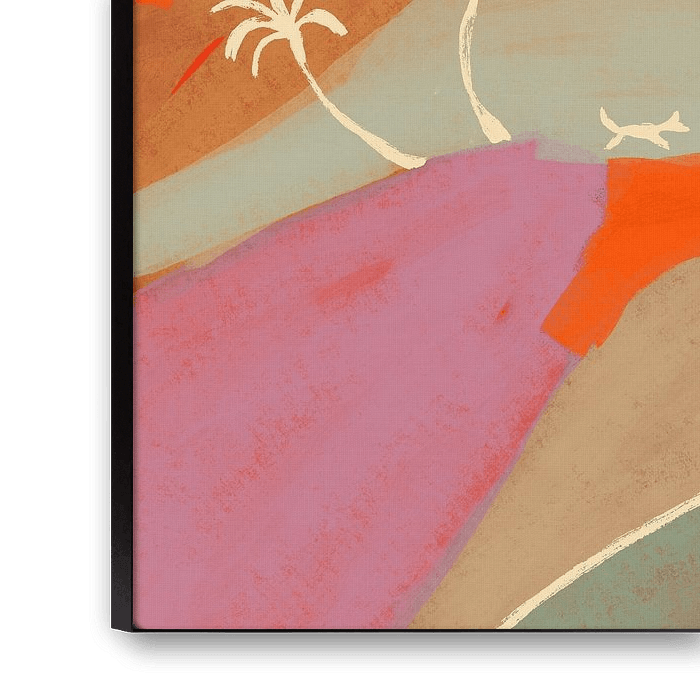 Un tableau coloré avec des zones aux tons chauds : orange, lilas, rose vif, vert tendre et rouge profond. Au premier plan, un simple dessin au trait de montagnes, deux palmiers et un petit chien. Le petit chien semble se diriger vers la pointe d'un rocher, comme pour contempler un instant le paysage. La combinaison de couleurs vives et de lignes ludiques confère à l'œuvre un caractère ensoleillé et décontracté.
