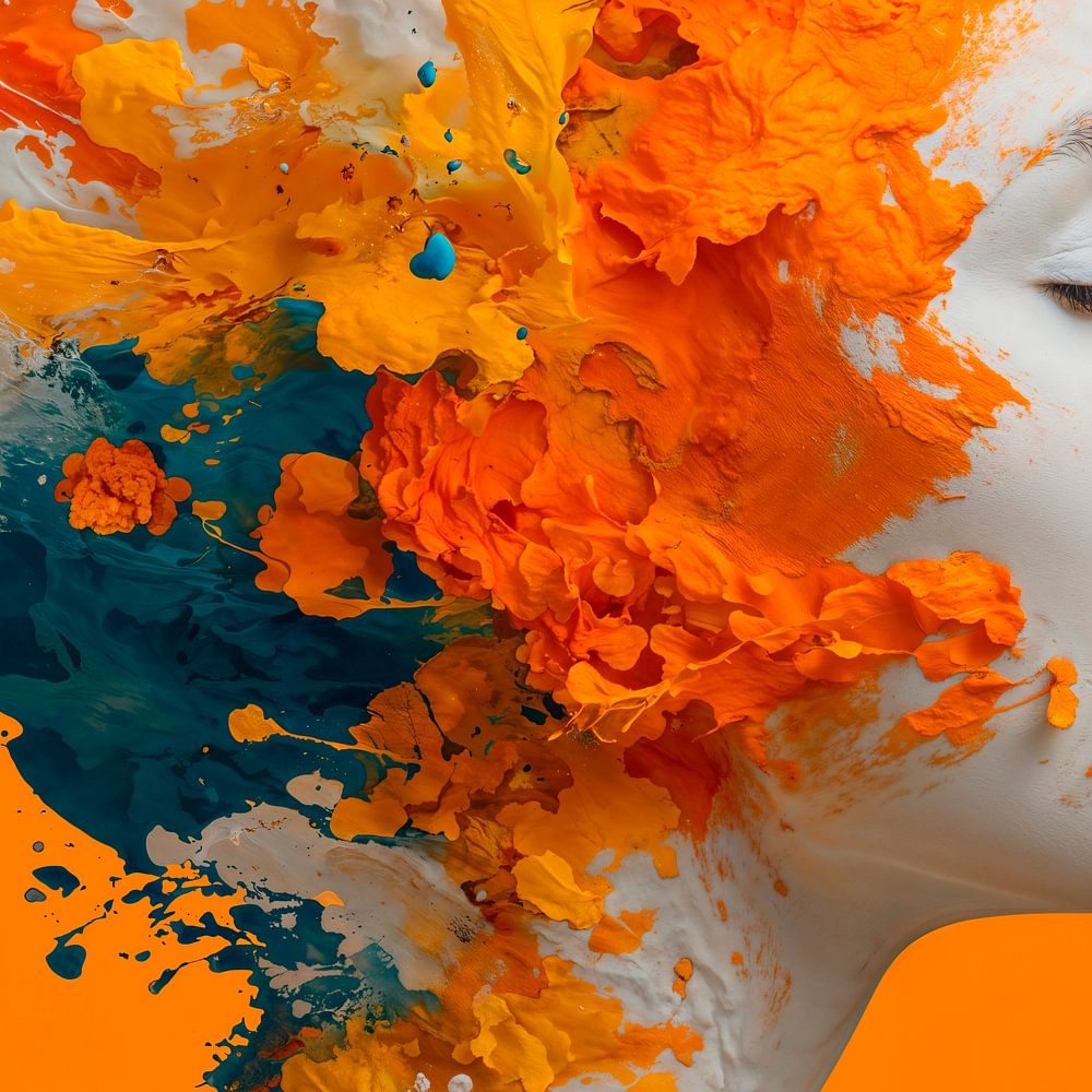 Une œuvre d'art représentant la tête d'une femme sur un fond orange vif. Ses cheveux semblent exploser dans une représentation chaotique mais artistique d'éclaboussures de peinture colorées. La peinture semble épaisse et texturée, avec des gouttes et des traînées qui s'envolent de sa tête, créant un effet dynamique et énergique. Le…
