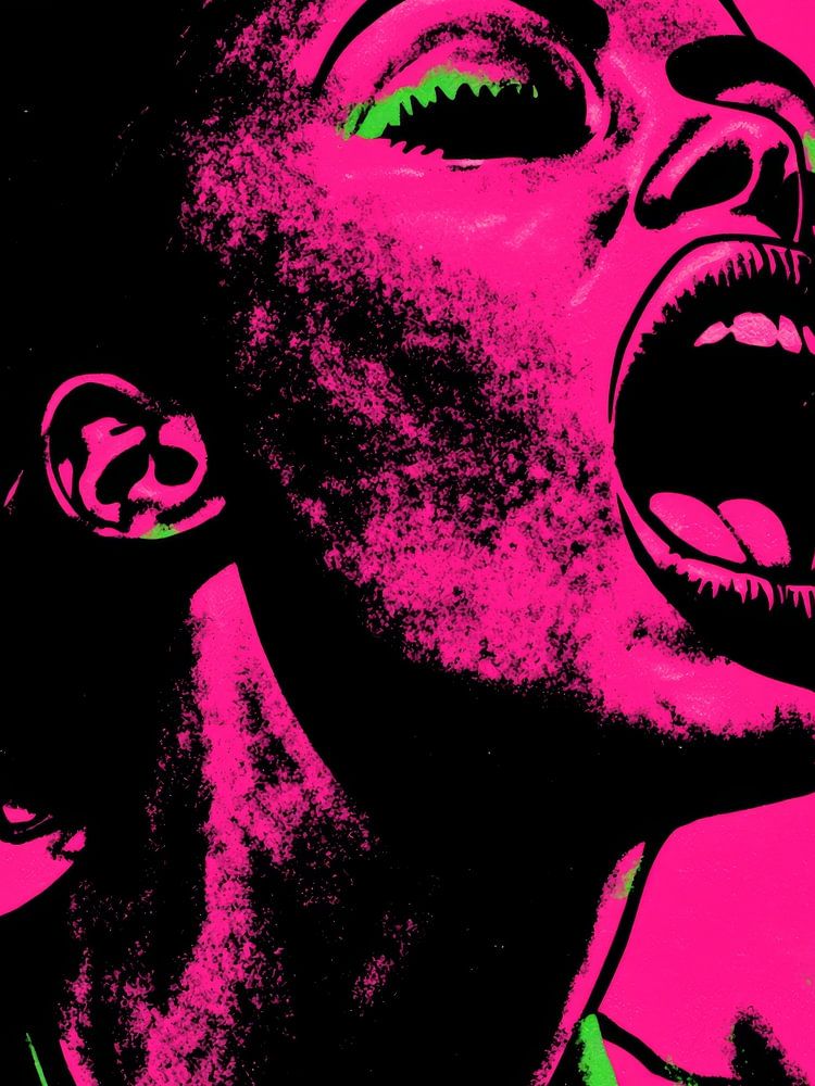 Cette création artistique numérique explosive déborde d'énergie et de puissance. Le visage criard de la femme, enveloppé de rose vif et de vert néon, semble pris au milieu d'une explosion visuelle. Les lignes rugueuses et éclaboussantes qui semblent jaillir de son corps et de ses cheveux renforcent l'impression de mouvement et d'émotion intense. Le contraste entre le fond noir profond et les couleurs fluorescentes rend cette œuvre presque électrique. Le style combine le pop art classique avec une esthétique punkish et brute qui rappelle les affiches underground vibrantes des années 1980. Les textures granuleuses et les éclaboussures de pigments néon confèrent à l'œuvre un aspect dynamique, propre à l'art de la rue. La puissance expressive du cri est palpable, comme si l'énergie explosait littéralement de l'image et entourait le spectateur. Cette œuvre est un complément parfait aux intérieurs modernes, aux espaces de travail créatifs ou aux espaces à l'atmosphère audacieuse et urbaine. Cette œuvre est parfaite pour les intérieurs modernes, les espaces de travail créatifs ou les espaces à l'atmosphère audacieuse et urbaine. Elle attire instantanément l'attention et se situe à cheval entre l'art et l'explosion visuelle. Idéale pour les amateurs d'art expressif et rebelle à l'allure énergique.