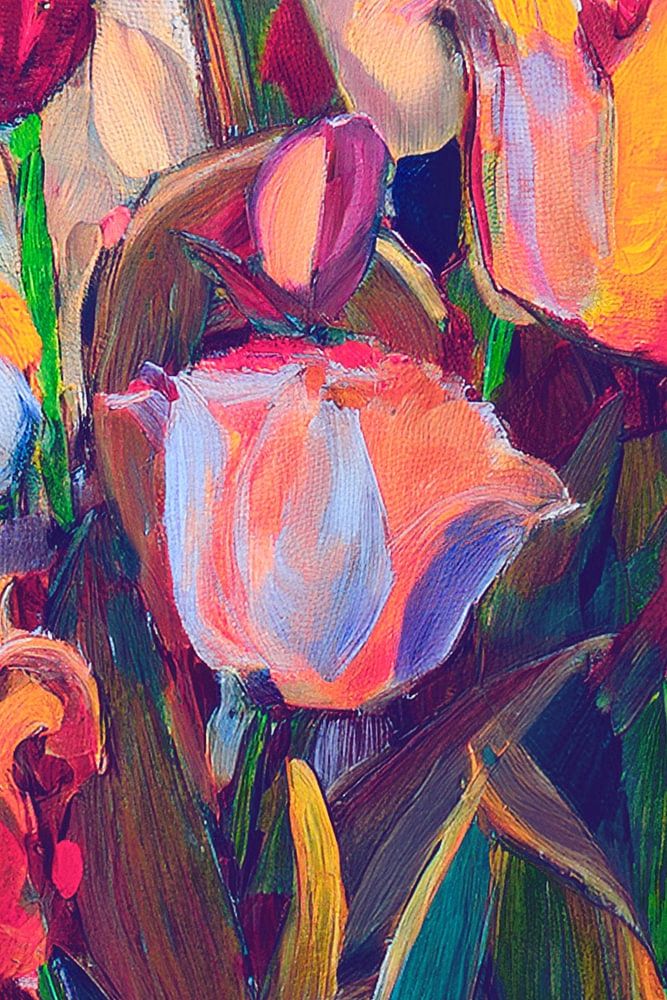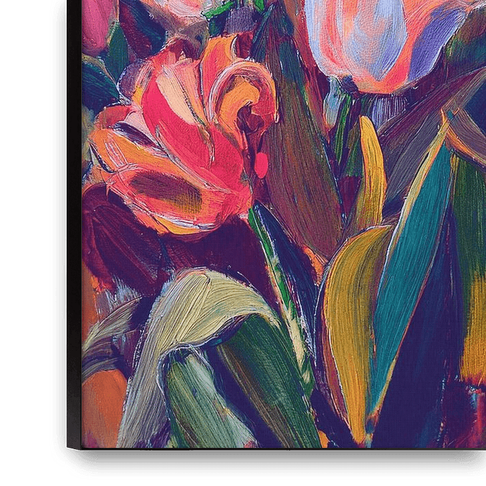 Des tulipes aux couleurs gaies et un lys ici et là font de cette composition une agréable nature morte. Intemporelle et vivante. Composée entièrement avec l'IA pour vous.