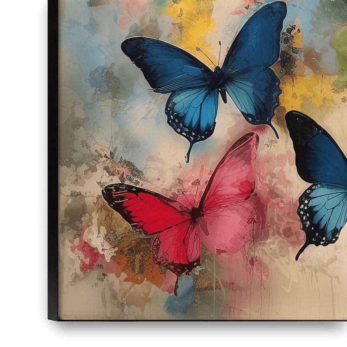 Une peinture numérique colorée avec une explosion rêveuse de papillons colorés. L'œuvre donne un aspect rêveur et classique à votre intérieur !