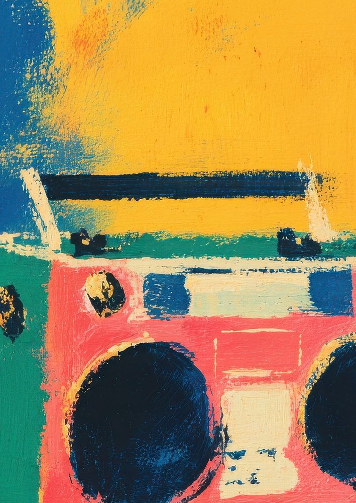 Cette peinture colorée et expressive montre un boombox jaune avec des accents bleus au centre d'une surface colorée. Les deux grands haut-parleurs noirs avec des centres rouges se détachent de manière marquante, tandis qu'un fin crayon d'antenne dépasse légèrement vers le haut. L'arrière-plan mélange le rose, l'orange et le bleu en…
