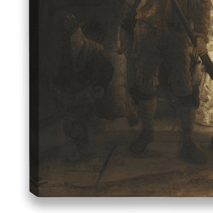 Extrait de la Ronde de nuit. La compagnie du capitaine Frans Banninck Cocq et du lieutenant Willem van Ruytenburgh se prépare à sortir, plus connue sous le nom de Ronde de nuit, est un tableau de milice du peintre néerlandais Rembrandt van Rijn (1606-1669), achevé en 1642. Le tableau est la propriété de la municipalité d'Amsterdam et fait partie de la collection du Rijksmuseum d'Amsterdam depuis 1808. La toile montre les deux archers du titre, accompagnés d'autres miliciens, ainsi que quelques figurants, alors qu'ils s'alignent. La Ronde de nuit est l'un des tableaux les plus célèbres au monde. Cette peinture était la contribution de Rembrandt à un projet de sept œuvres, six pièces de milice et un portrait des hommes de cible des Kloveniersschutters, commandées par la guilde de la milice d'Amsterdam pour la grande salle de bal du Kloveniersdoelen. C'est la première et la seule pièce de milice de Rembrandt. Comparée à d'autres toiles du genre, l'œuvre de Rembrandt est une composition vivante et audacieuse, dans laquelle la milice ne pose pas dans la disposition statique habituelle, mais est représentée en se regroupant. La toile est une œuvre riche d'une complexité baroque, dans laquelle réalisme et symbolisme sont habilement combinés dans une intégration magistrale du mouvement, de la lumière et de la couleur, mis en harmonie par un délicat motif de clair-obscur. Sous ces aspects, la Ronde de nuit représente l'apogée de la peinture de Rembrandt.