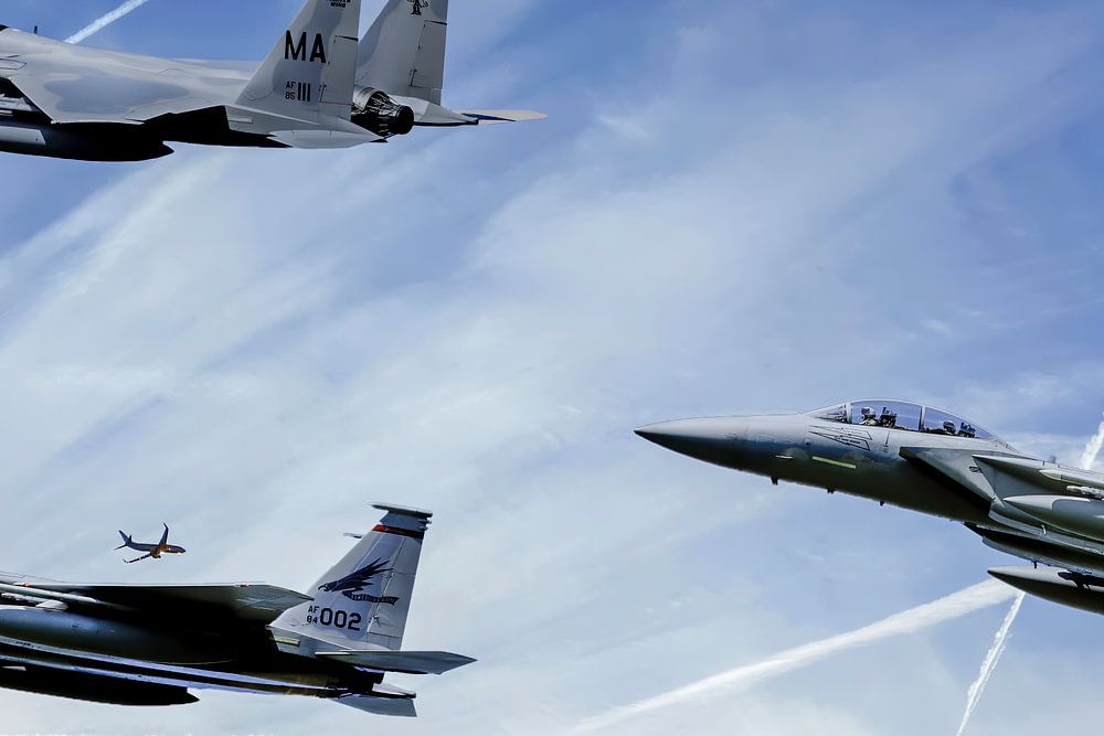 3 American F-15 Eagle en vol. L'arrière-plan a été ajusté par le photographe. Photo prise lors de l'exercice Frisian Flag sur la base aérienne de Leeuwarden.