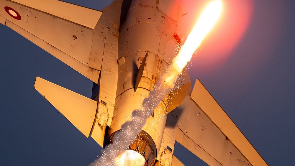 Un F-16 danois utilise ses fusées éclairantes lors de sa présentation en solo au Sanicole Sunset Airshow 2024 à Leopoldsburg.