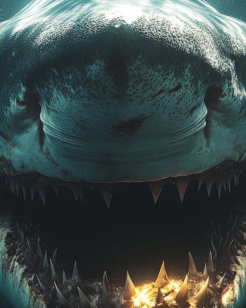 Dans les sombres profondeurs de l'océan, un grand requin blanc émerge, puissant, majestueux et d'une beauté terrifiante. La lumière du soleil perce à travers l'eau, illuminant ses dents acérées et son regard féroce. Un rappel que la puissance brute de la nature se trouve sous les vagues, invisible mais inarrêtable.