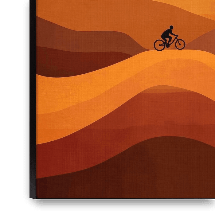 Dans de doux tons de terre, un paysage ondoyant se déploie, illuminé d'un éclat doré par le soleil couchant. Un cycliste solitaire glisse à travers ce décor harmonieux, comme s'il arrêtait le temps. Les tons chauds et les lignes courbes invitent à la rêverie et à la découverte.
