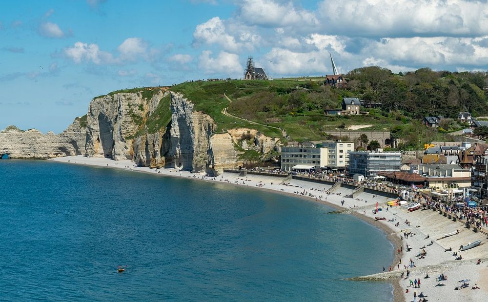 Jolie vue estivale de la belle et atmosphérique ville d'Étretat en Normandie. Cette attraction touristique est toujours très animée, mais par une belle journée d'été, elle l'est encore plus. Les falaises s'élèvent magnifiquement au-dessus de la ville.
