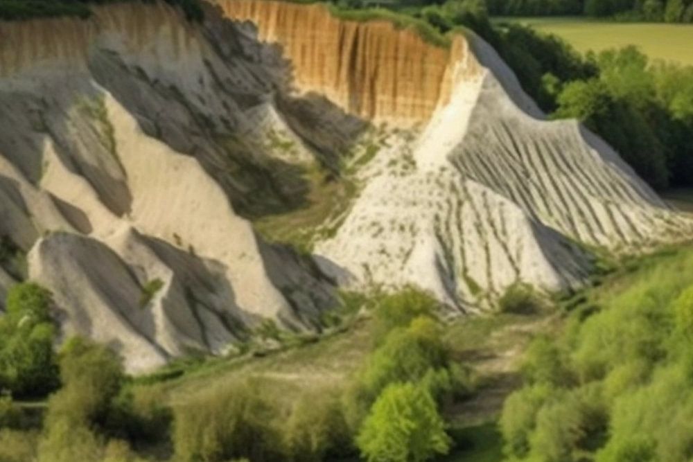 Ce paysage impressionnant présente des falaises abruptes et érodées avec des couches de terre vivement exposées qui alternent dramatiquement avec des forêts denses et vertes. La lumière vive du soleil fait ressortir les structures déchiquetées et projette des ombres profondes qui soulignent les contours et les contrastes naturels. Cette œuvre est idéale pour les amoureux de la nature et les collectionneurs de paysages, car elle met en valeur la beauté brute et l'interaction dynamique de la terre et du feuillage.