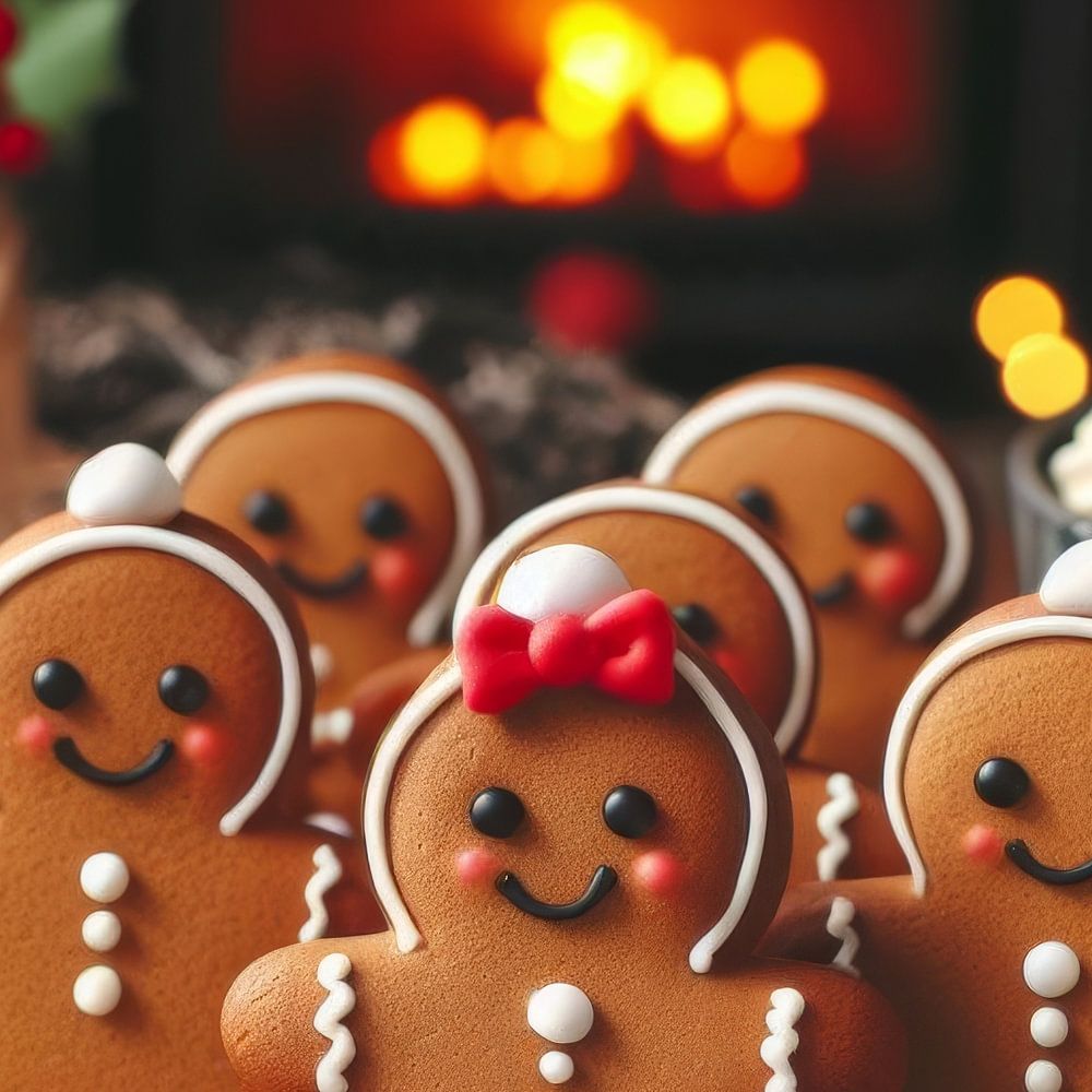L'image montre un groupe de cinq hommes en pain d'épices disposés sur une table devant une cheminée. La cheminée est décorée de bas de Noël et éclairée par un feu chaleureux. Les bonshommes en pain d'épices sont décorés avec du glaçage blanc et trois d'entre eux ont des détails en glaçage rouge. Le bonhomme en pain d'épices au centre porte un nœud en glaçage blanc avec un centre rouge. La table est également décorée de lumières de Noël, de sucres d'orge, d'anis étoilé, de bâtons de cannelle et d'un bol de guimauves. L'ensemble de la scène évoque une atmosphère de Noël chaleureuse et festive.