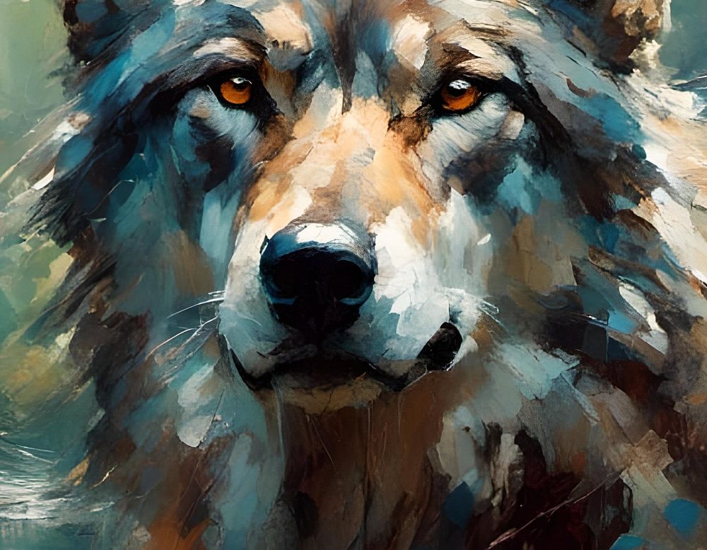 Un loup détaillé et expressif est au centre de l'attention, représenté avec un réalisme saisissant sur une toile de fond naturelle floue. L'utilisation de la lumière et de l'ombre donne à la fourrure du loup une qualité tactile, et le regard intense de l'animal transmet un sentiment de sauvagerie.