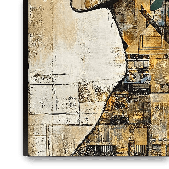 Femme Fleurs Cheveux - Il s'agit d'un tableau de femme représentant le profil latéral d'une femme, une peinture abstraite moderne avec une texture mixte de type collage dans des tons beige et or subtils et avec des fleurs frappantes dans les cheveux, un tableau de femme paisible et une peinture de femme.