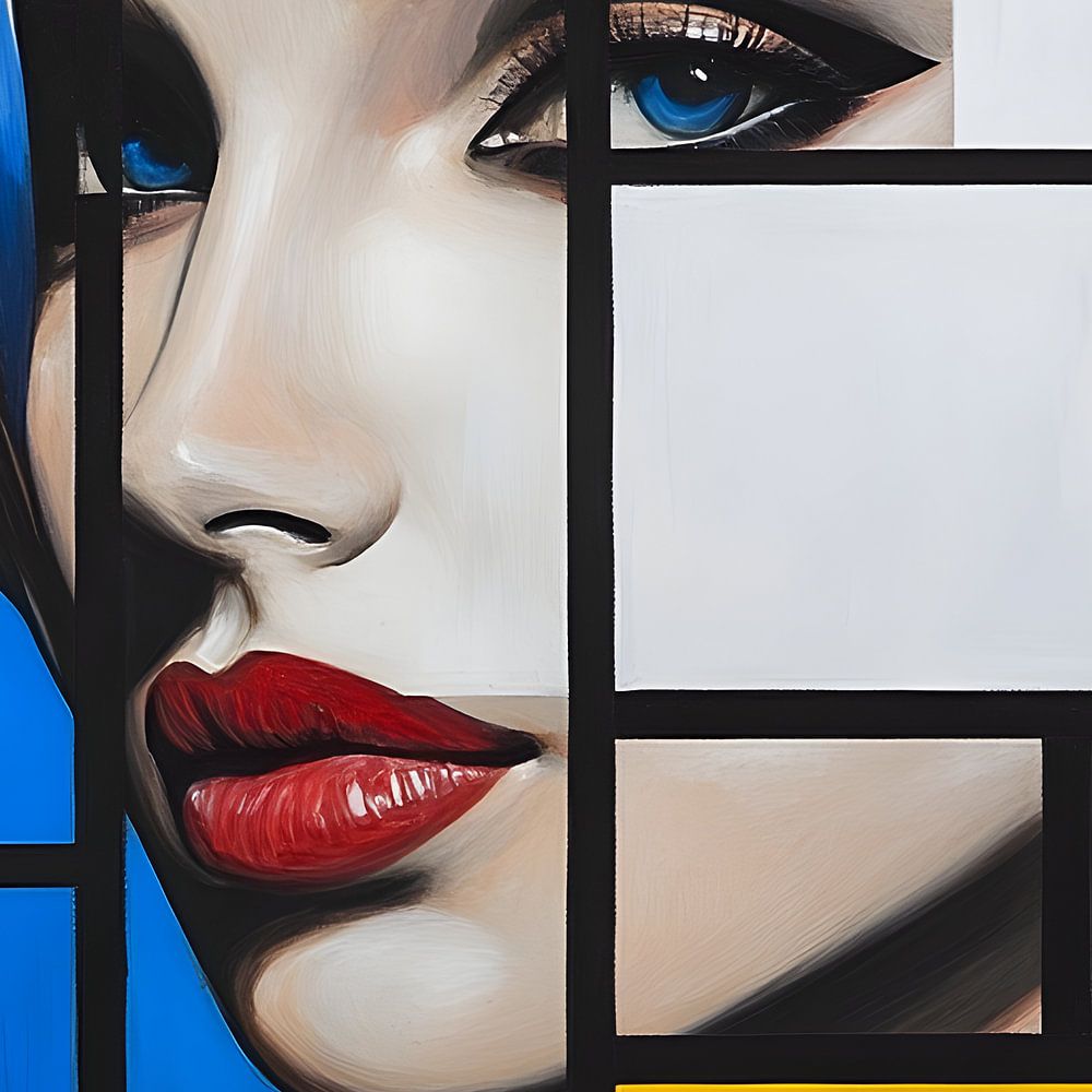 Femme dans un abstrait de Piet Mondrian. Bleu, rouge, jaune, blanc et noir.