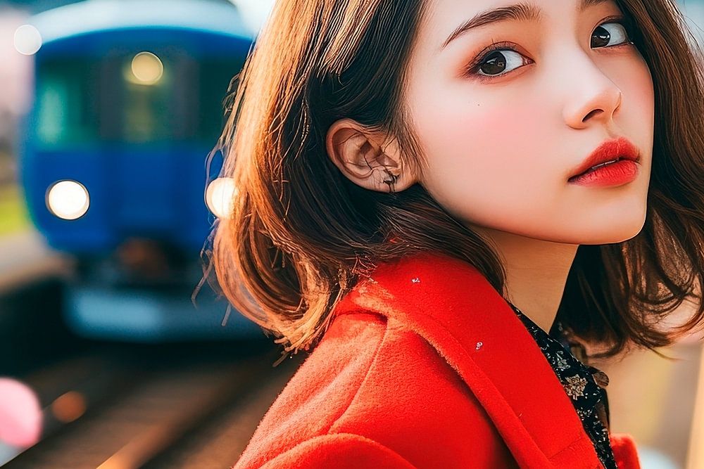 Une interaction vivante entre le rouge vif et la douceur des pétales s'unit dans cette scène captivante à la gare. Les trains envoûtants en arrière-plan et le regard enchanteur de la protagoniste confèrent à la pièce une énergie dynamique. Parfait pour le salon, pour stimuler les conversations et créer une atmosphère inspirante.