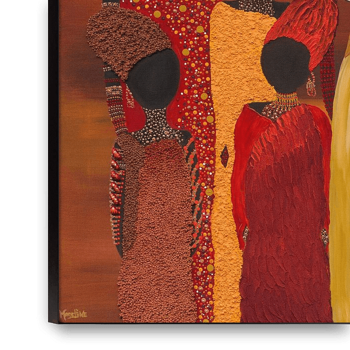 Nana montre un groupe de femmes africaines majestueuses qui forment ensemble une image puissante et harmonieuse. Elles sont proches les unes des autres, chacune avec sa propre pose et sa propre silhouette, mais clairement reliées par la couleur et le rythme. Les tons chauds de rouge, d'orange et d'or dominent l'œuvre, donnant à la peinture un aspect intense, presque incandescent. L'arrière-plan renforce cette chaleur et permet aux figures de se détacher, pour ainsi dire, en donnant à l'ensemble une forte présence.