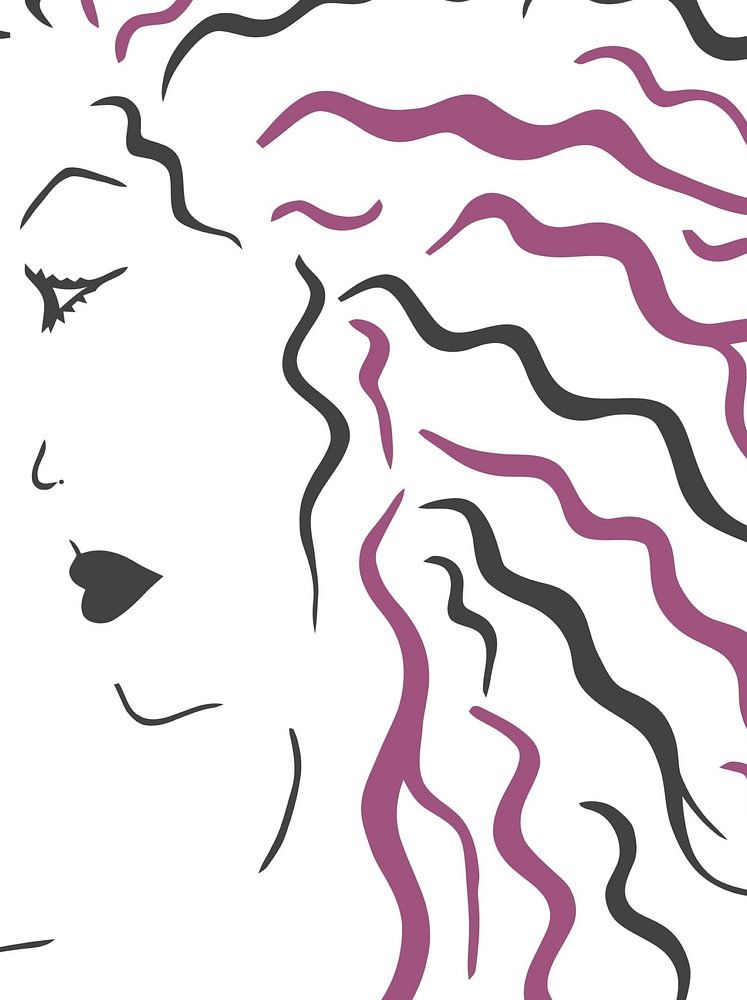 Il s'agit d'une illustration d'une femme. La femme est représentée de profil. Elle a des cheveux bouclés roses et noirs qui lui arrivent aux épaules.