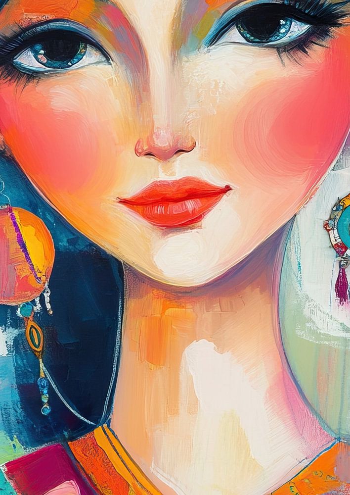 Femme avec boucles d'oreilles - Ce portrait féminin coloré montre une jeune femme avec de grands yeux et des boucles d'oreilles détaillées et colorées sur un fond vibrant et abstrait.