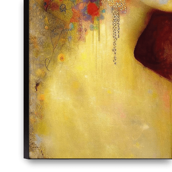 Femme avec des fleurs dans les cheveux. Couleur principale : or, et autres couleurs vives.