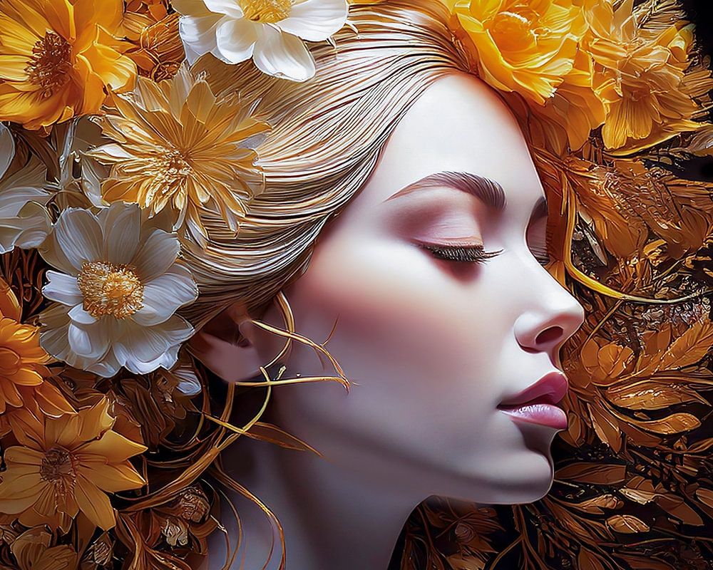L'image montre un subtil portrait hyperréaliste d'une femme de profil, entourée d'une luxuriante guirlande de fleurs aux teintes dorées. Son visage dégage un calme serein, un éclairage doux mettant en valeur les contours raffinés de son visage. L'arrière-plan est mystérieusement sombre, mettant en valeur à la fois la femme et les fleurs. Le contraste entre l'ombre et la lumière ajoute un effet dramatique, rehaussant l'élégance et l'expression du portrait.