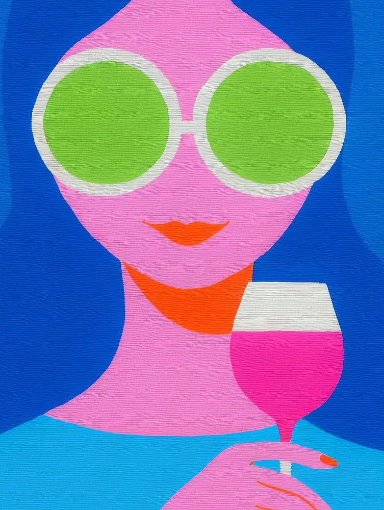 Cette illustration moderne respire l'élégance et la simplicité estivales. Une femme aux grandes lunettes de soleil rondes et aux cheveux brillants tient un verre de rosé, regardant calmement vers l'avant. Les couleurs sont vives et contrastées : le bleu vif, le rose vibrant et le vert frais remplissent l'image d'énergie. Sa posture est détendue et confiante, comme si elle profitait d'une douce soirée au bord de la mer. Le style minimaliste et les aplats de couleur confèrent à l'œuvre une grande force graphique. Malgré l'absence de détails, son look en dit long : chic, moderne et plein de caractère. La texture douce du pinceau crée une subtile impression de textile. La combinaison de la simplicité et des teintes vibrantes rend l'œuvre parfaite pour les intérieurs contemporains. Il dégage une atmosphère d'été, de style et de liberté. Une ode à la vie moderne, capturée dans la couleur et la forme.