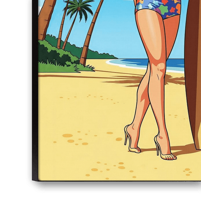 Illustration d'une femme en maillot de bain et chapeau de soleil, appuyée sur une planche de surf à la plage. Les palmiers et le ciel bleu sont en arrière-plan.