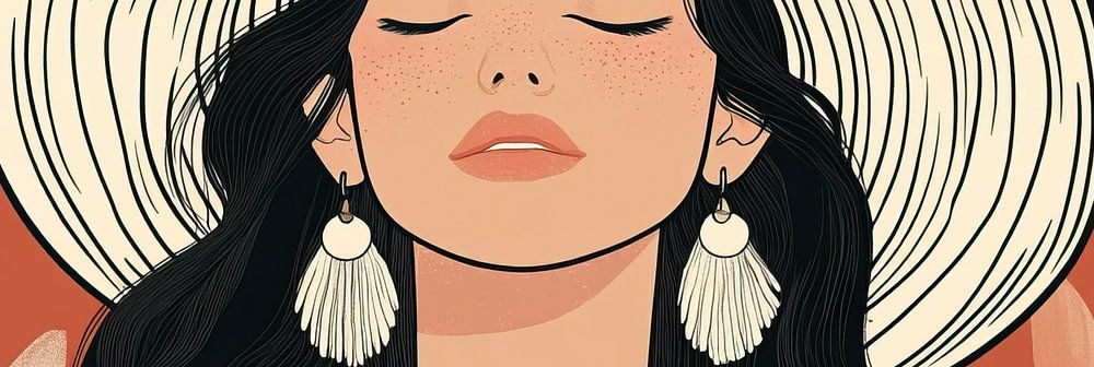 Détails : peinture de femme, peinture apaisante, feuilles, chapeau, boucles d'oreilles, art moderne, peinture zen, couleurs douces, relaxation, féminin