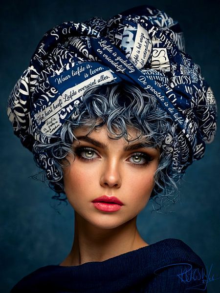 Cette œuvre d'art numérique de l'artiste René van den Berg représente une femme qui dégage à la fois force et vulnérabilité. Ses yeux clairs et pénétrants constituent le centre silencieux de l'image et regardent directement le spectateur. La tête est enveloppée d'un tissu sculptural, composé de couches de typographie et de phrases sur…