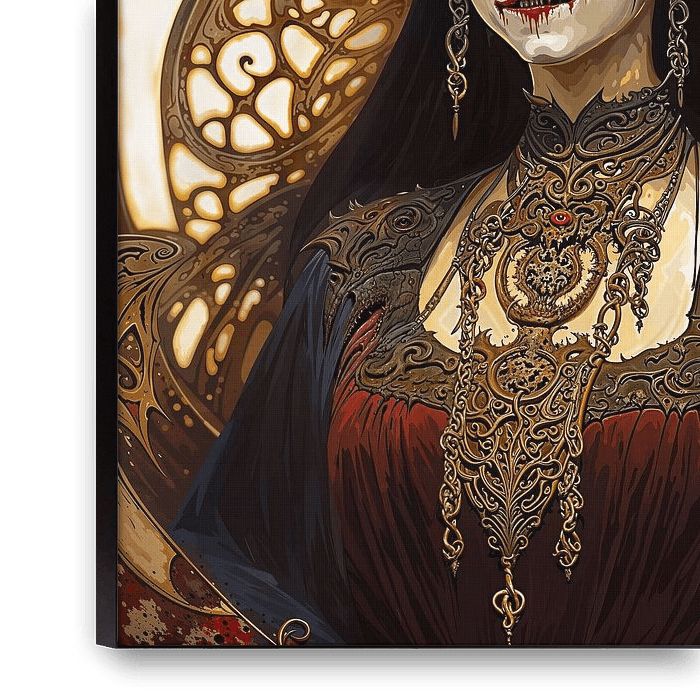Une femme démoniaque aux yeux rouges, de style gothique, avec des cornes et vêtue de dentelle. Générée à l'aide d'une intelligence artificielle.