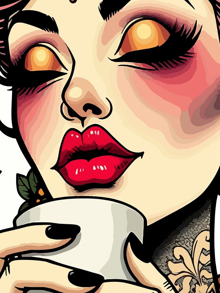 Illustration de style pop art représentant une femme élégante aux cheveux noirs et à la robe rouge, tenant un verre à une table de bar.